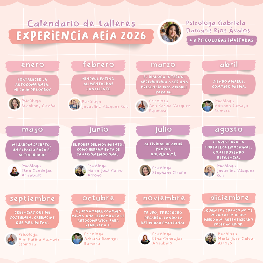 Con tu Agenda Florecer 2026 podrás ser parte de La Experiencia Aeia donde acompañada de 8 psicólogas especialistas en desarrollo de Autoestima y Amor propio, tendrás acceso a más de 16 actividades y talleres en vivo por zoom en los que explorarás de forma integral tu desarrollo emocional, espiritual y mental.